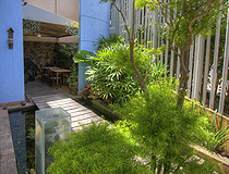 No Hotel/Pousada o espaço externo possui jardim com fonte transmitindo uma sensação bucólica e de paz, apesar de estar fixada num bairro movimentado e muito bem centralizado na cidade de Salvador.